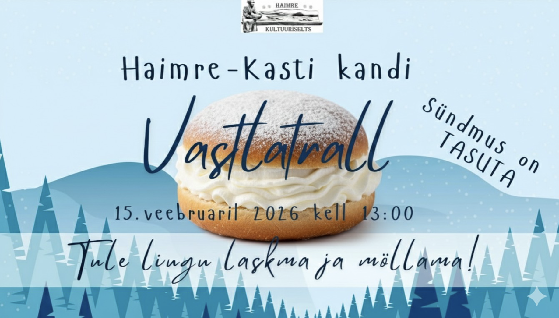 Haimre-Kasti-Mõisamaa kandi VASTLATRALL! 13:00 kogunemine Haimre rahvamajas Suundume üheskoos BUSSIGA Järta mäele Lustime, kelgutame & selgitame välja pikimad liud Seejärel kulgeme bussiga tagasi RAHVAMAJJA, kus ootavad vastlakuklid ja soe jook Parimate liulaskjate autasustamine; osalejate vahel õnneloos Orienteeruv lõpp: kell 16:00 Haara kaasa oma kelk! Riietu ilmale sobivalt ja soojalt! Oodatud on nii suuremad kui väiksemad...