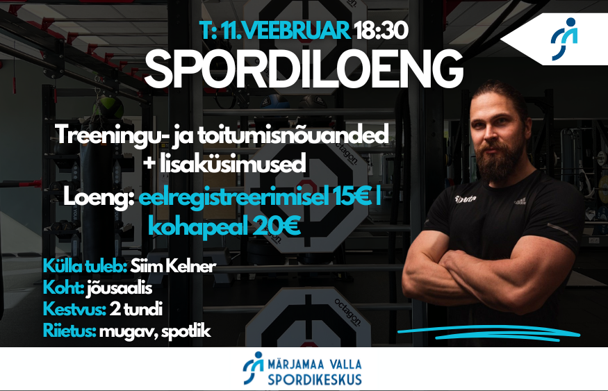 🚀 Siim Kelneri spordiloeng – pane oma keha tööle ja saavuta rohkem! 11. veebruaril kell 18:30 tuleb Siim Kelner Märjamaa Spordihoonesse, et jagada teaduslikult tõestatud ja praktilisi nõuandeid, kuidas oma keha enda kasuks tööle panna! Mida oodata?